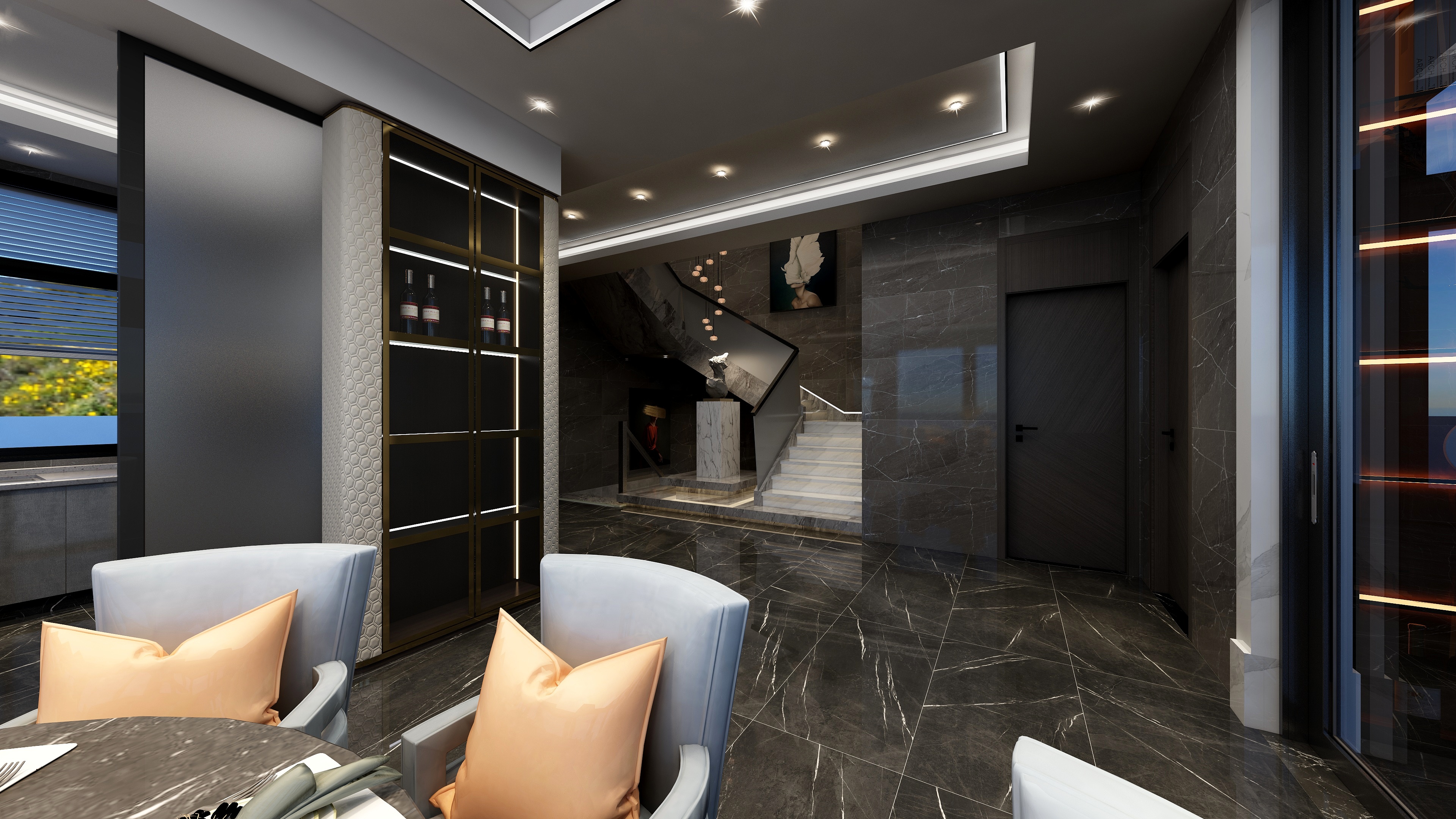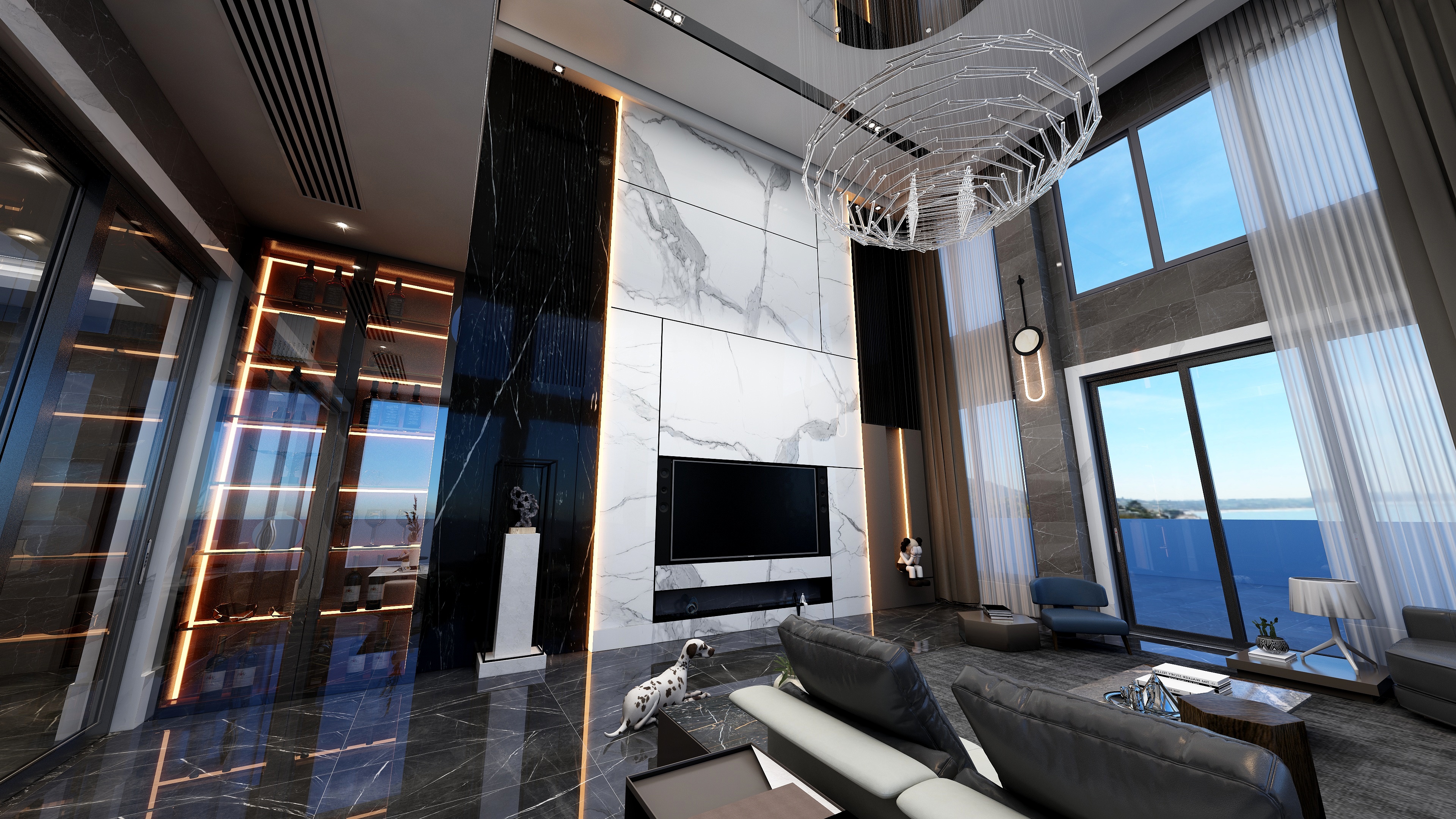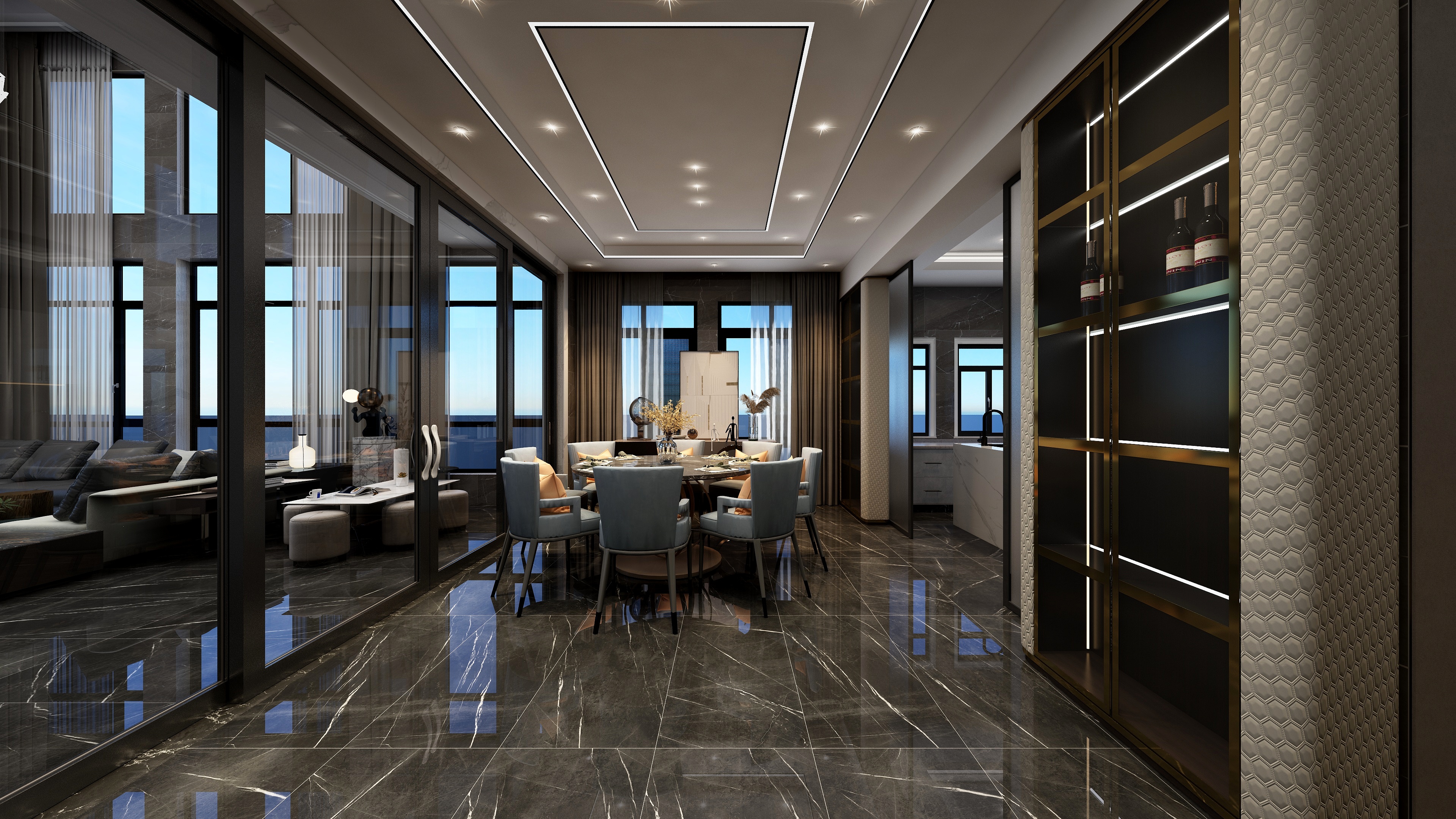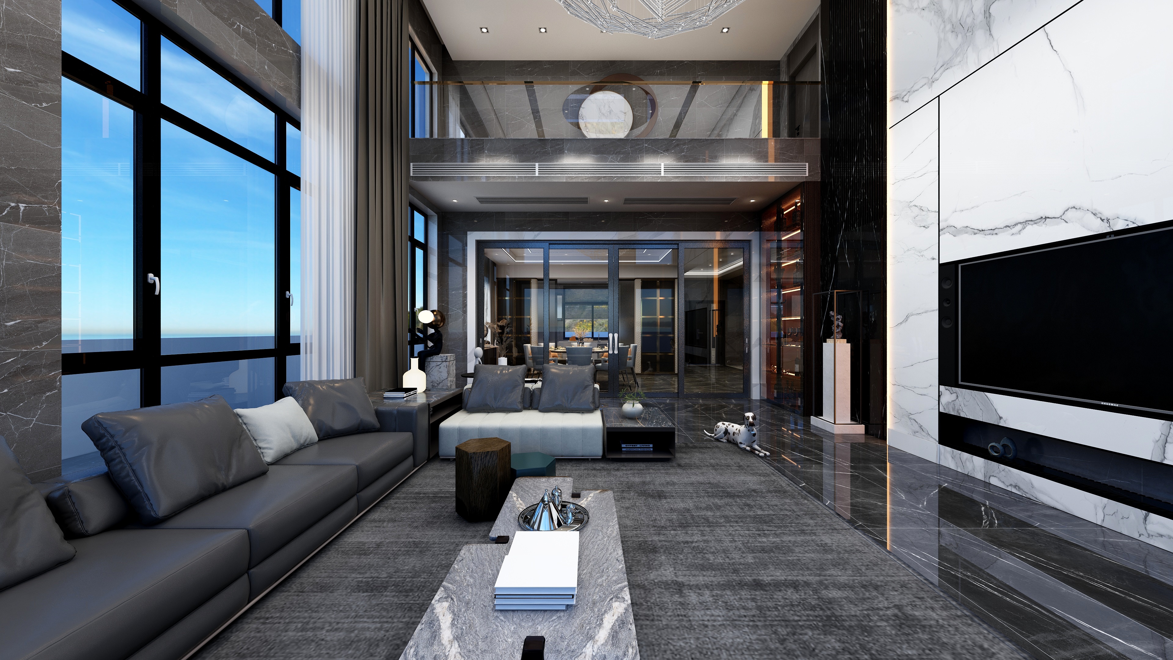 本案極具現(xiàn)代高級(jí)都市感,材質(zhì)上大面積使用高檔石材和NAPPA真皮,背景墻由木飾面和天然石材鋪貼而成。整體顏色以深色灰調(diào)和大理石為主,再以爵士白石材突出現(xiàn)代感。